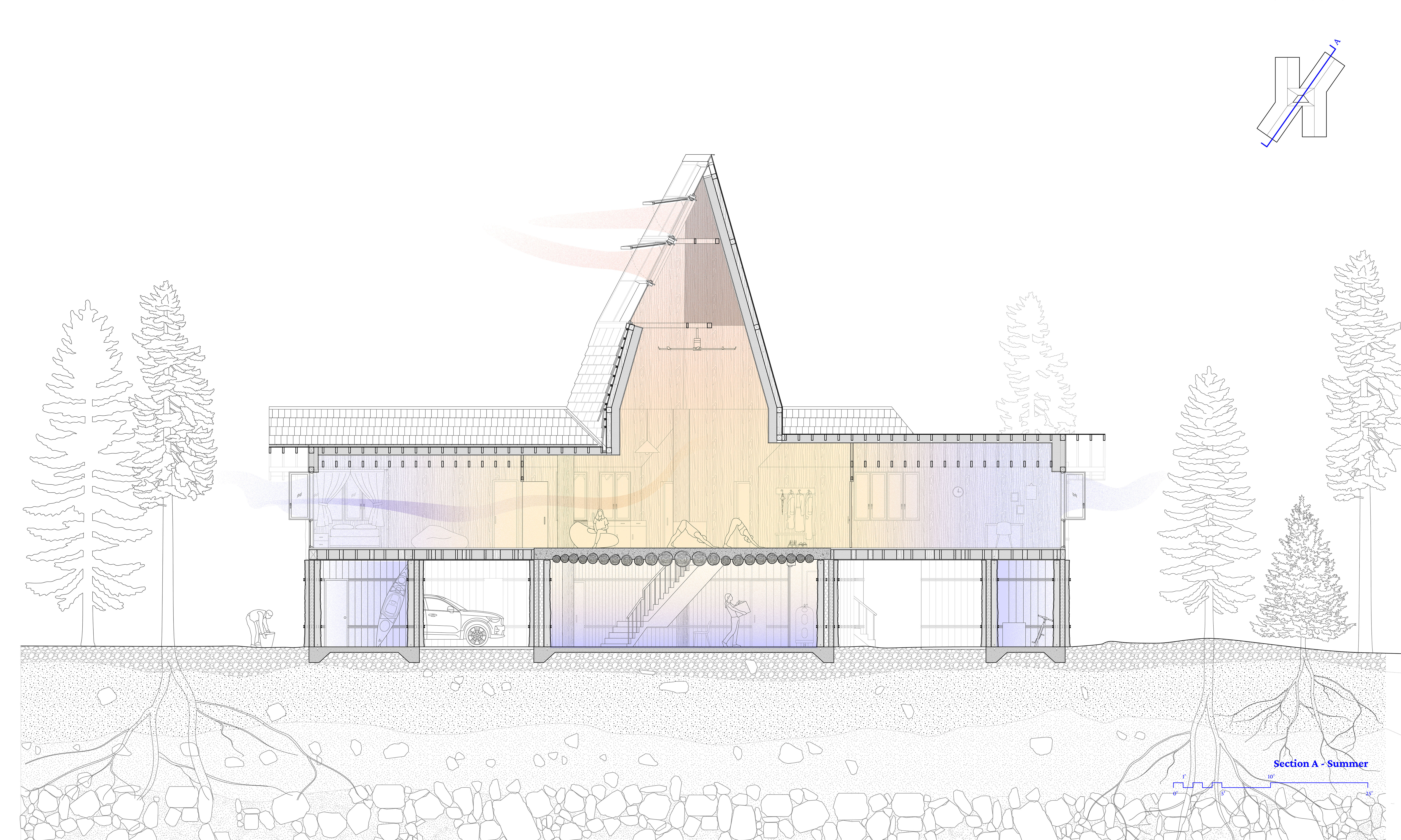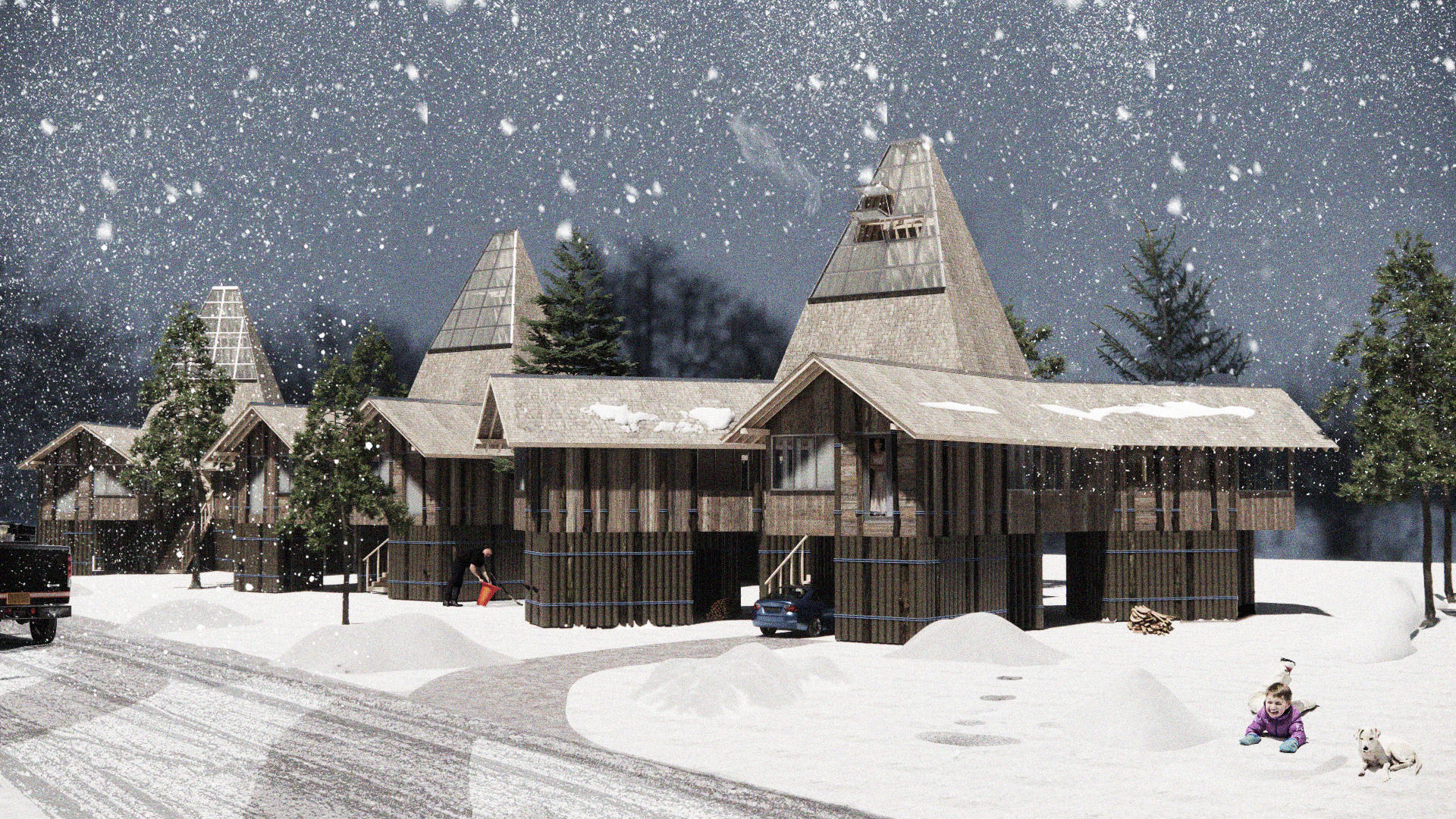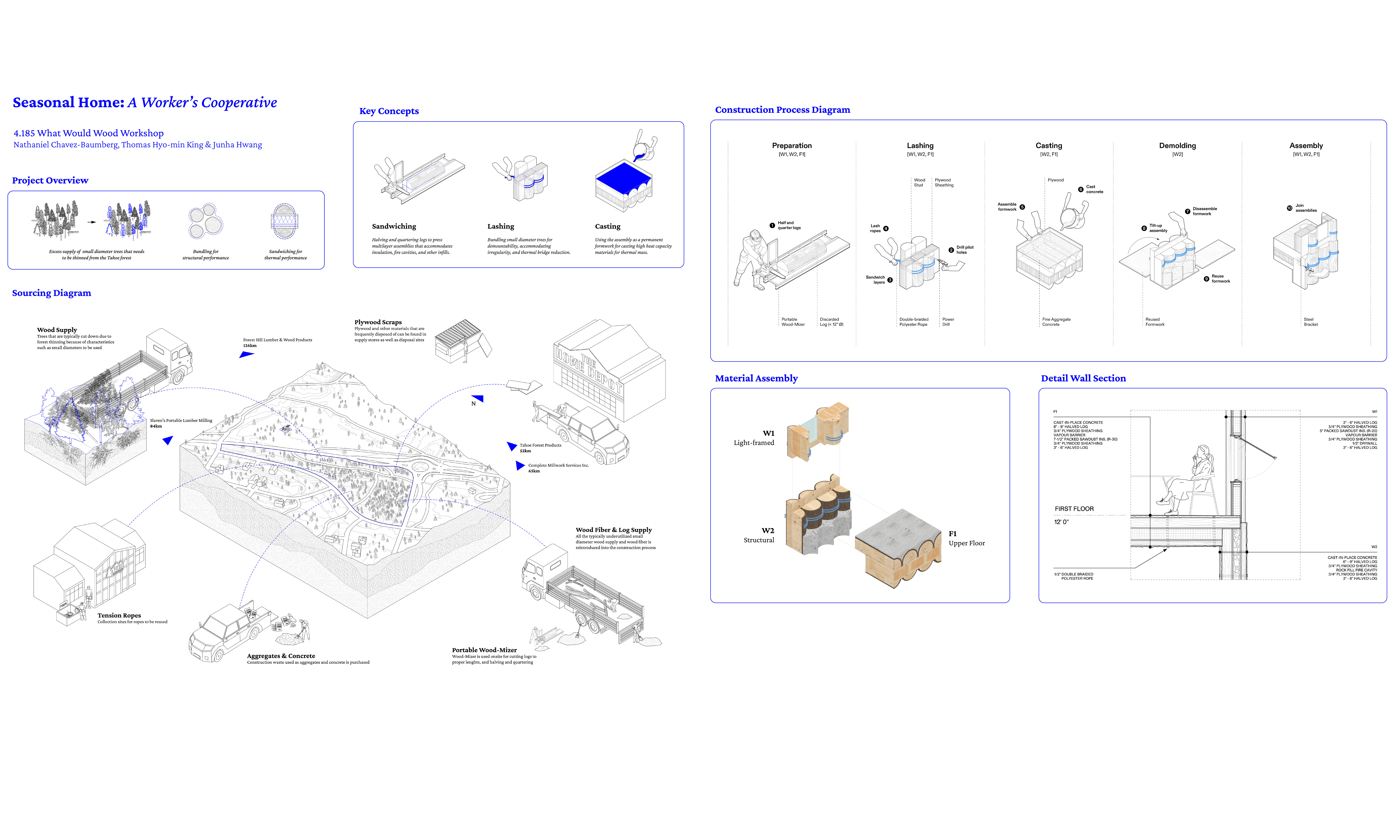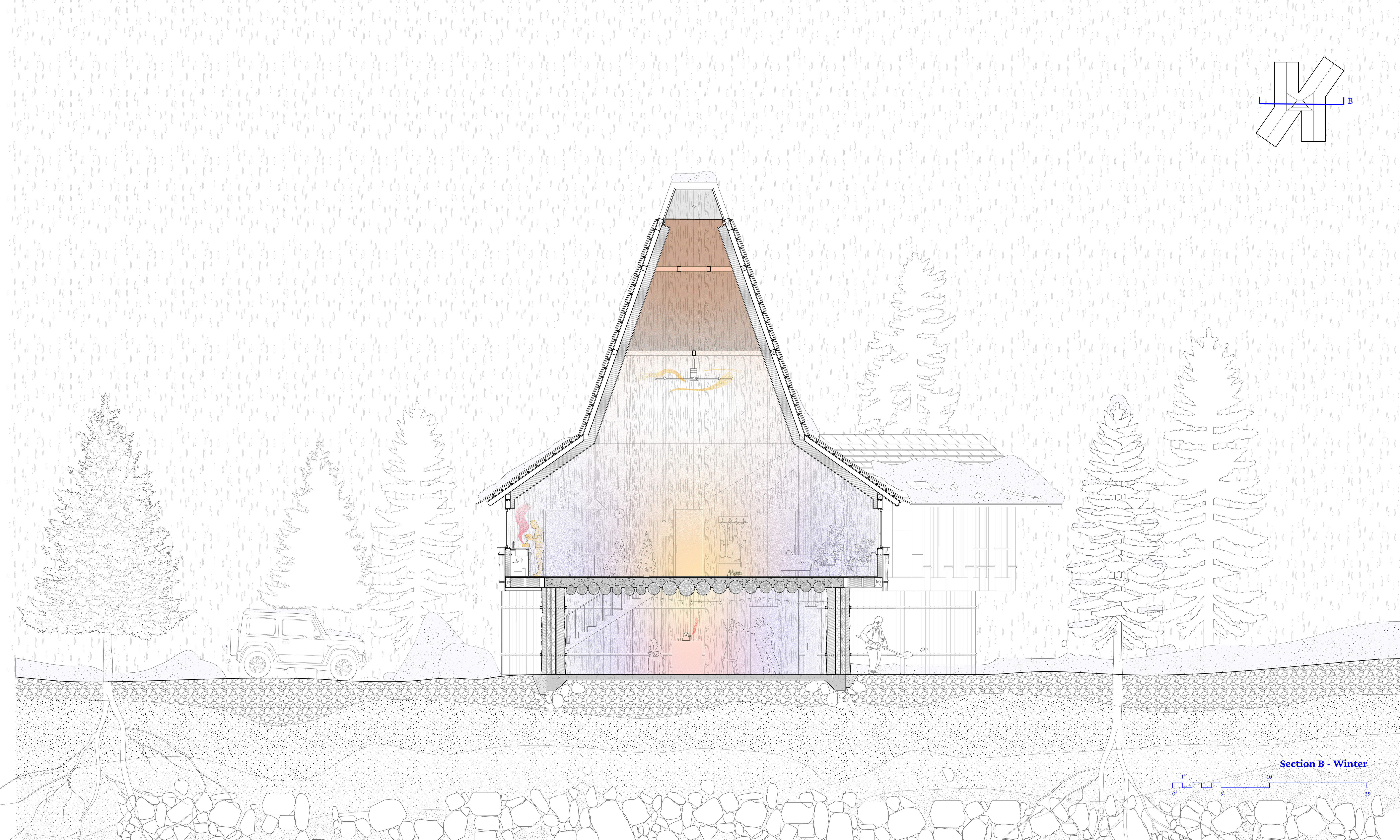 Located on Pomo Street near South Lake Tahoe’s tourist corridor, the project addresses the region’s housing shortage by accommodating two rotating seasonal worker communities across seasons. Solid at its base and becoming lighter as it rises, the structure mirrors the forest’s vertical gradient, organizing communal space around a shared hearth and a tall solar chimney that gathers and distributes heat and resources. Constructed from minimally processed timber—split into halves and quarters—that layers composite systems that cradle insulation and thermal mass, the home becomes a seasonal shelter grown from the forest’s excess.