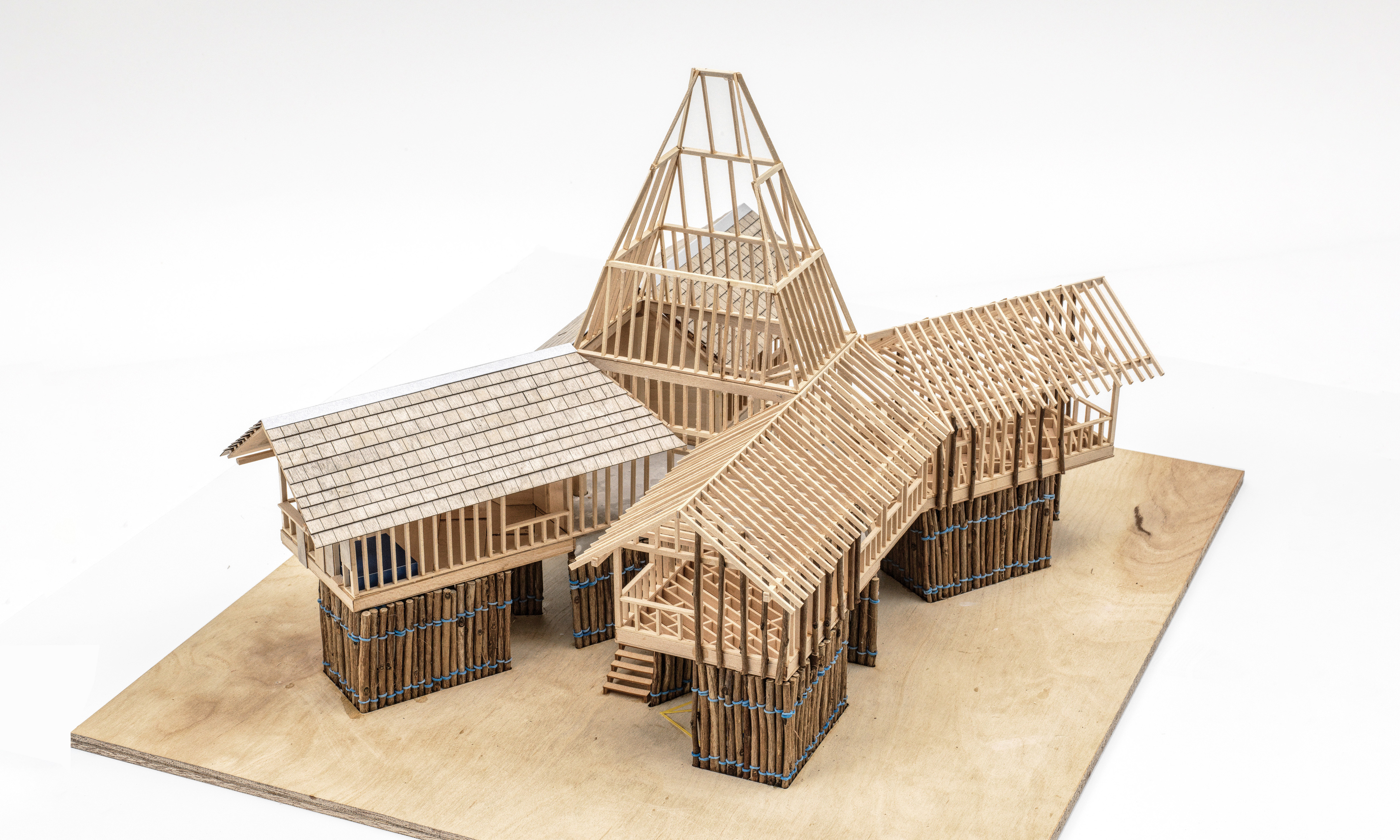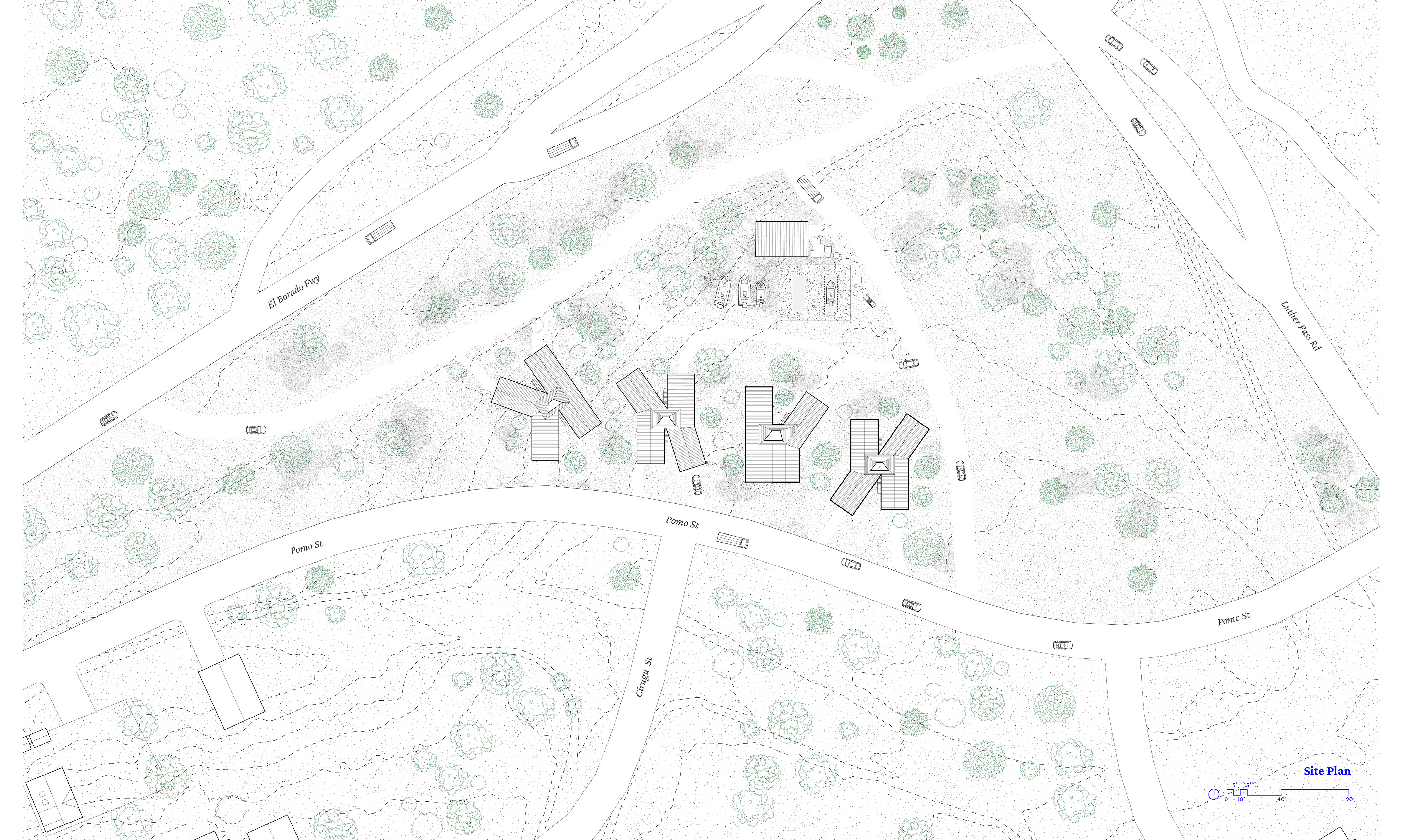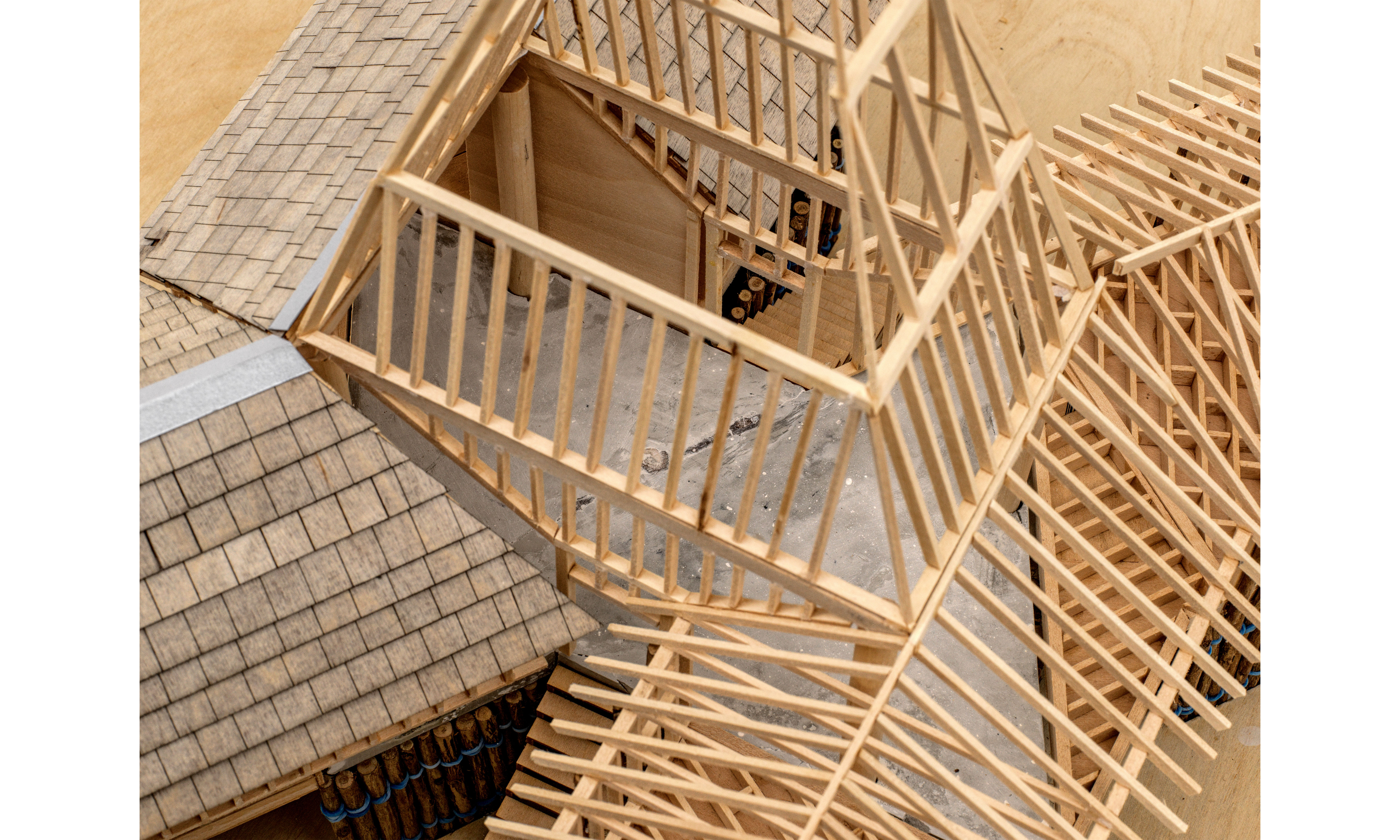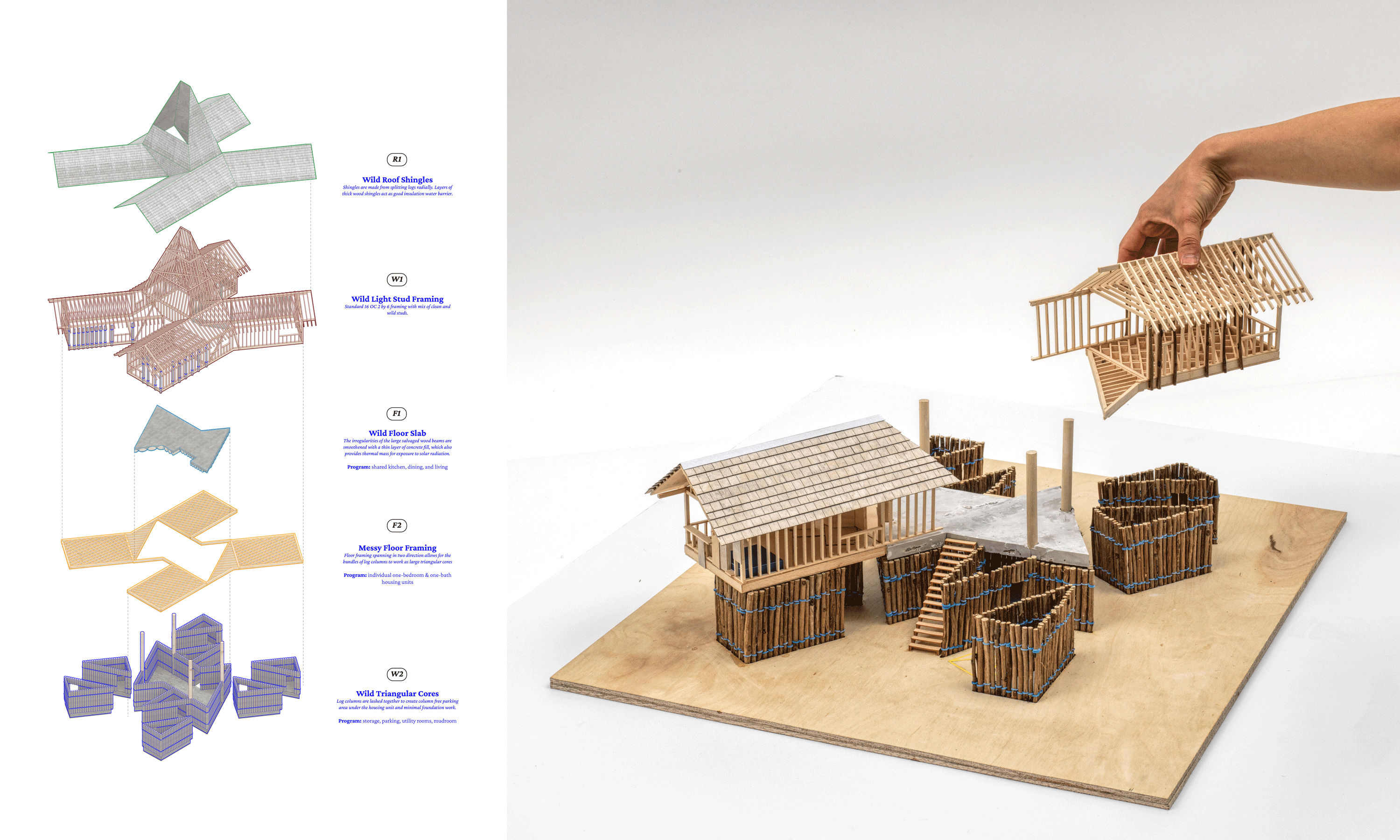 Located on Pomo Street near South Lake Tahoe’s tourist corridor, the project addresses the region’s housing shortage by accommodating two rotating seasonal worker communities across seasons. Solid at its base and becoming lighter as it rises, the structure mirrors the forest’s vertical gradient, organizing communal space around a shared hearth and a tall solar chimney that gathers and distributes heat and resources. Constructed from minimally processed timber—split into halves and quarters—that layers composite systems that cradle insulation and thermal mass, the home becomes a seasonal shelter grown from the forest’s excess.