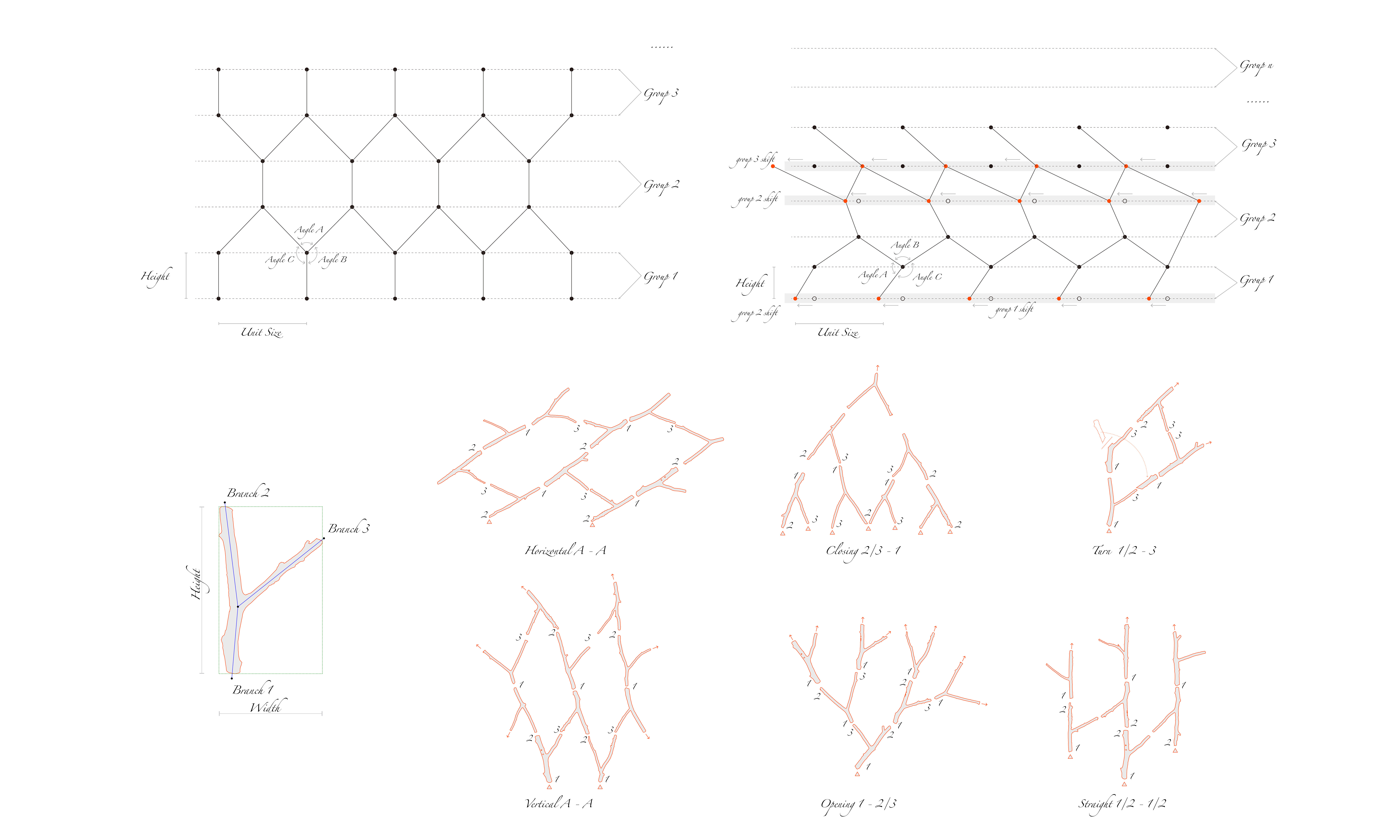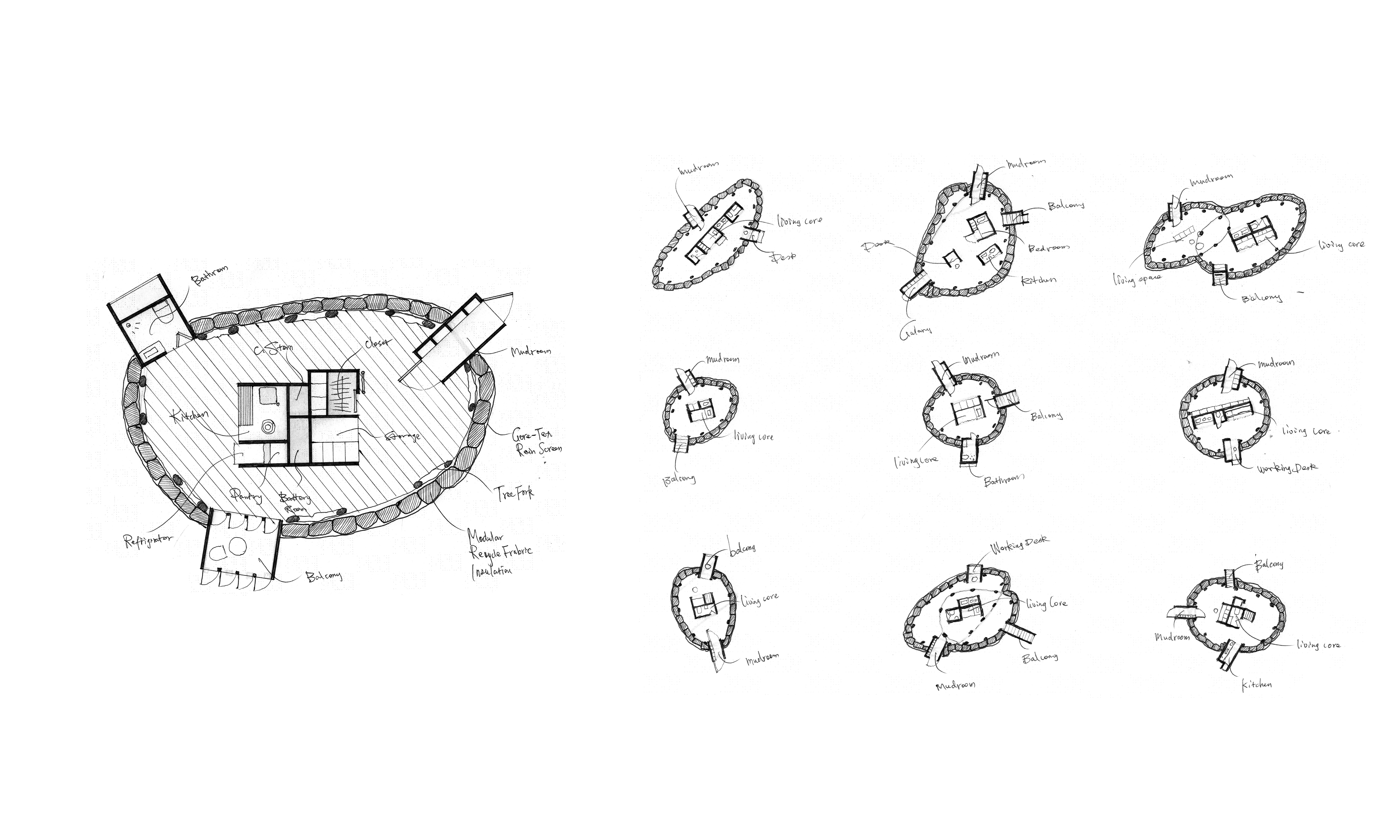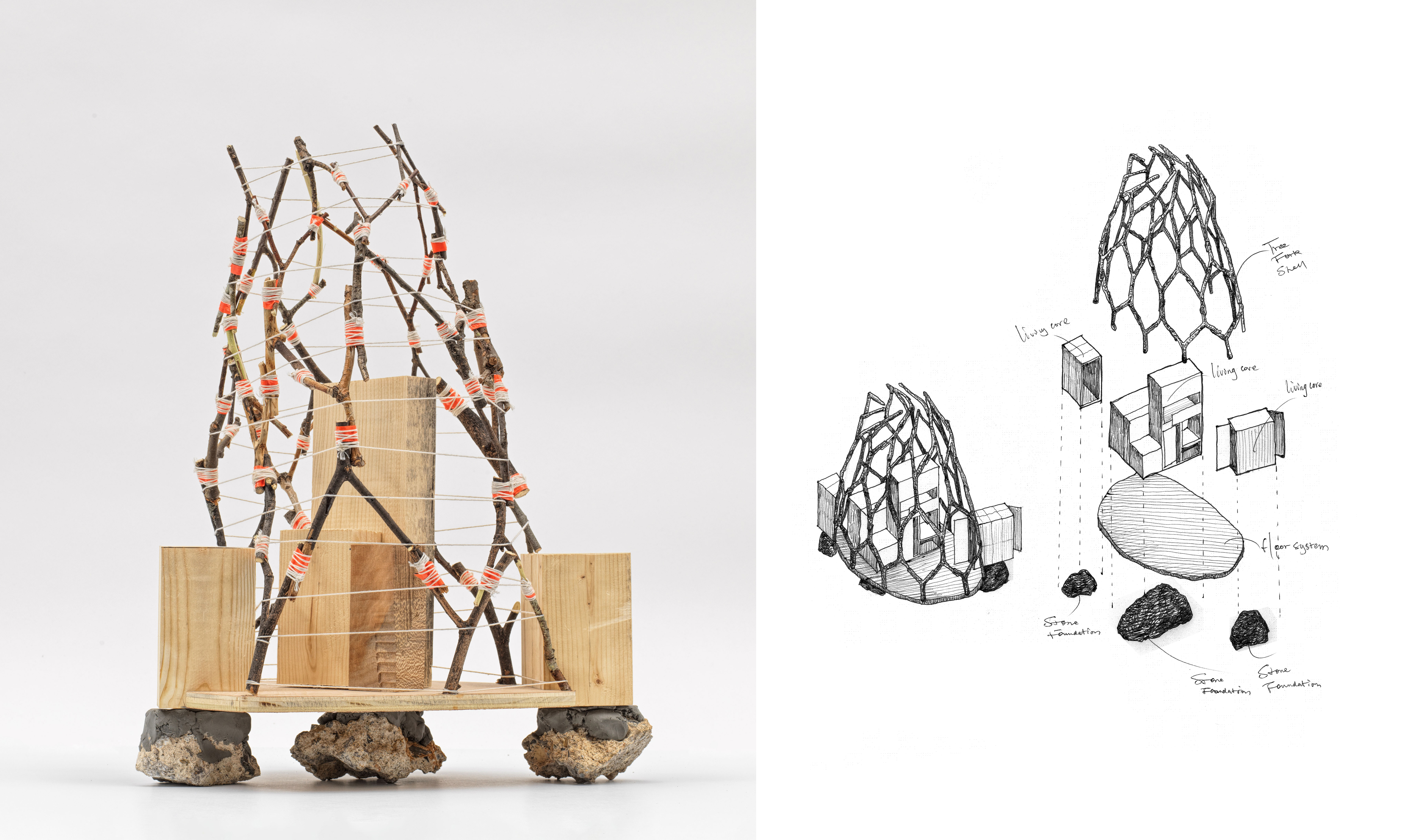 YYY investigates the use of commonly found Y-shaped tree branches as structural elements. Using a non-digital shape grammar approach, it translates the natural geometry of branches into reproducible and scalable designs, enabling rapid assembly. The system ultimately supports low-cost, modular housing, with customizable living units for sleeping, dining, hygiene, and study, enclosed within branch-based structural shells. The building envelope is made from locally recycled high-performance athletic fabrics, using soft materials to adapt to the unpredictable geometry of the structure. Linda Qian contributed to this project as a collaborator in the parallel workshop.